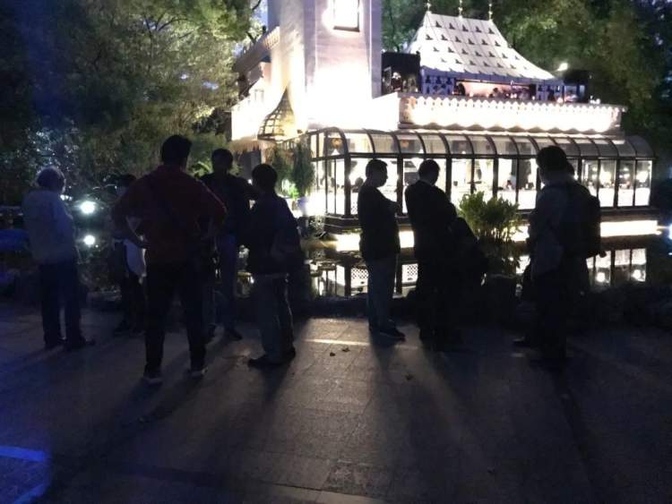 在我和老陈搭话前,他和一对年轻老外交流了一阵。他看到这对老外在拍荷花池对面的芭芭露莎餐厅,就从建筑风格开始了搭讪。