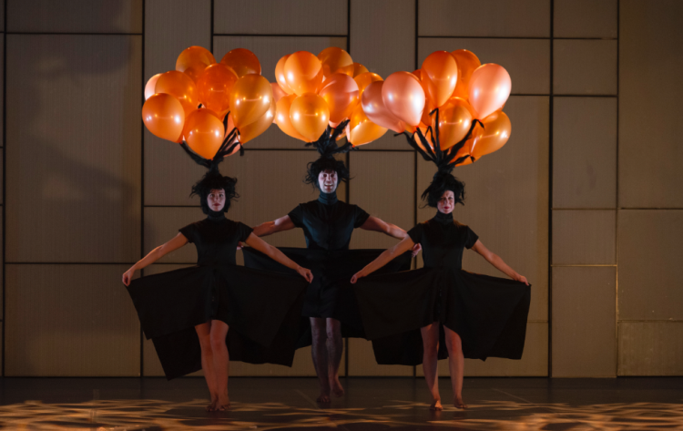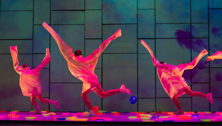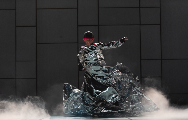 《舞蹈的游戏》里,主创们将时间进行切割,展现了不同场景:系在头发上的气球仿佛随时带人会飞到空中;未来感十足的银色光面“机器人”在舞台上滑行;长长的袖子和宽大的衣服把人变成一个迎风飞舞的气球;配合多媒体投影,观众还可以再来一场沉浸式的升级打怪游戏。