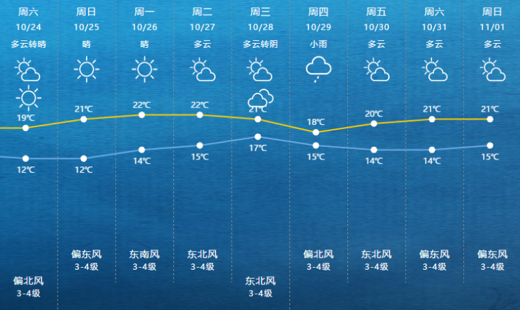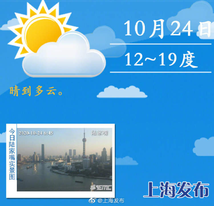 最低12℃!今日魔都阳光继续露头,早晚还需多加衣 周到君 2020-10-24 来源:周到上海 今天阳光继续露头,晴到多云天气,北到东北风,风力3-4级。今天最高温度19℃,最低温度12℃。 ■上午9时实时温度,全市在15-18℃之间 今天早晨晴到多云,气温略低为12-16℃;早起出门的话需要注意保暖,全天空气较为干燥,记得多喝水,补充水分。 未来几天本市还是以晴到多云天气为主,气温也较平稳,整体感觉上比较舒适,大家可以继续享受秋高气爽的好天气。 来源:周到上海 作者:周到君 赞一个 (0)
