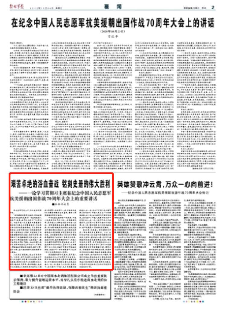 “抗美援朝战争伟大胜利,将永远铭刻在中华民族的史册上!永远铭刻在人类和平、发展、进步的史册上!”10月23日, 纪念中国人民志愿军抗美援朝出国作战70周年大会隆重举行,习主席出席大会并发表重要讲话。习主席的重要讲话,全面回顾总结了抗美援朝战争的伟大胜利和巨大贡献,深刻阐述了抗美援朝精神的历史意义和时代价值,精辟揭示了抗美援朝战争的历史启示,郑重宣示了捍卫国家领土主权和统一、维护地区和世界和平稳定、推动构建人类命运共同体的坚定立场和决心,必将进一步激励我们铭记伟大胜利,敢于斗争、善于斗争,奋力推进新时代强国强军伟大事业。