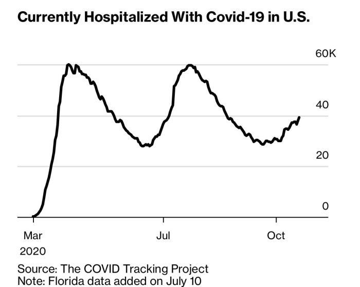 彭博社报道称,全美新冠肺炎患者住院人数再次呈现上升趋势,截至10月20日达到3.9万人,是8月22日以来的新高,其中8178人入住重症监护病房,1889人需要依靠呼吸机辅助治疗。美国疾病控制与预防中心预测,在接下来的四周,新冠肺炎住院患者每天或将增加6200人。