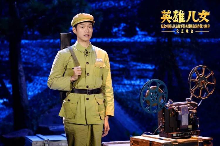 晚会上,魏大勋饰演黄继光的战友李继德,为观众讲述特级英雄黄继光的故事。李继德老人回忆往昔,亦感慨今日之和平,“就是因为有千千万万个黄继光这样的英雄!”
