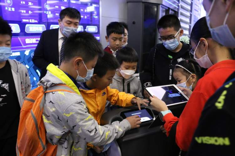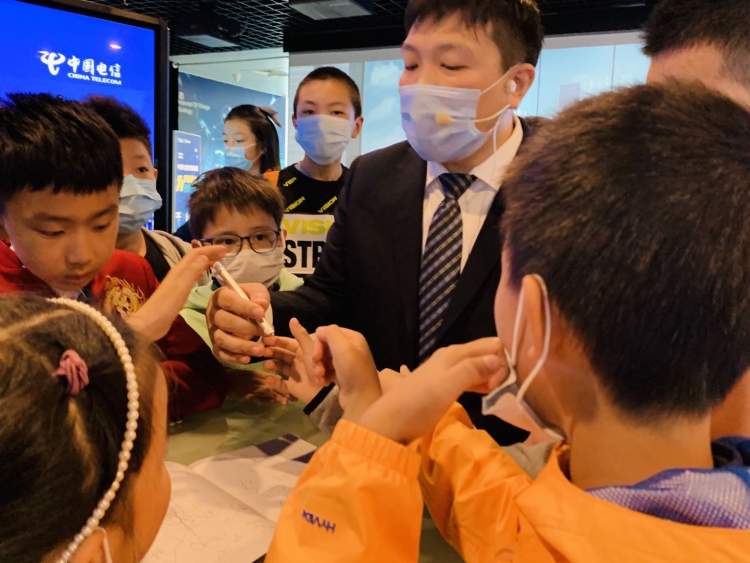 跟随讲解员,青少年们在“印象电信”展区探索通信发展史,了解到“海光缆敷设”过程中的重重难点,惊叹于中国电信建设的天地一体化“云网融合”项目。