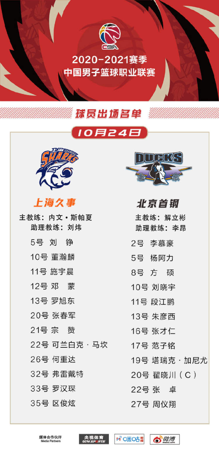 本场比赛,斯帕夏安排后卫施宇晨进入名单,上场比赛迎来首秀的状元区俊炫依旧在名单中。北京这边,虽然是全华班出战,但休赛期引进的内线明星李慕豪和范子铭均在列。