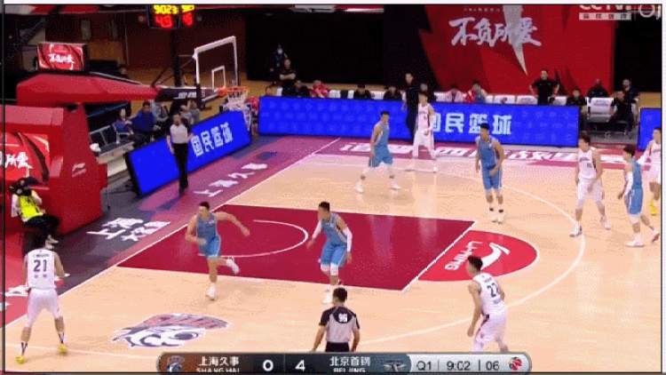 上海男篮延续上一场宗赞和董瀚麟的首发内线组合,北京则是率先派上范子铭坐镇禁区。开场后,上海连续出现失误,进行了3分钟后才由宗赞命中底角三分打破进球荒。北京男篮没有将进攻的重点放在内线,而是依靠牵制转移球,几位射手在外线做文章。