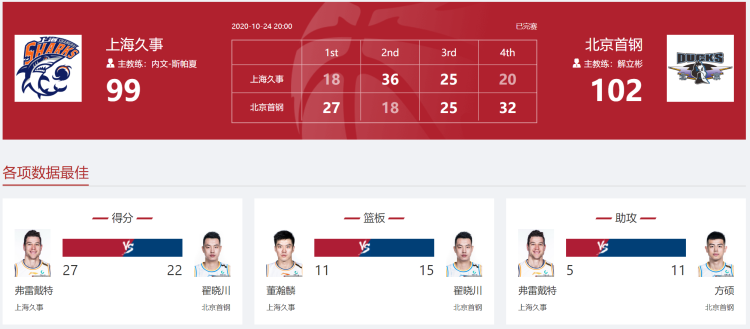 北京时间24日晚,2020-2021赛季CBA联赛第四轮上海久事男篮对阵北京首钢,凭借弗雷戴特第二节的高效表现上海男篮领先了大半场比赛,但末节关键球方硕挺身而出帮助北京逆转比赛,以102比99带走胜利。