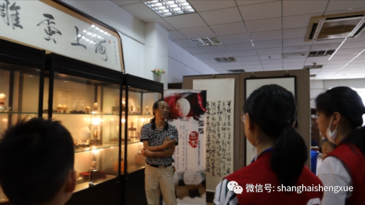 暑假的一个星期六,宝山区淞南镇文化活动中心的三楼,光线有些昏暗。当我轻轻推开中间一扇门,眼前顿时一亮:一排展示柜里,一个个大小不同、造型各异的蛋雕,在灯光的照射下旋转……展示柜旁边站立的,正是我们的采访对象——淞南蛋雕技艺非遗传承人袁家钊爷爷。他个头不高,身材略显消瘦,一条马尾辫梳得一丝不苟,虽年过六旬,精神头十足。