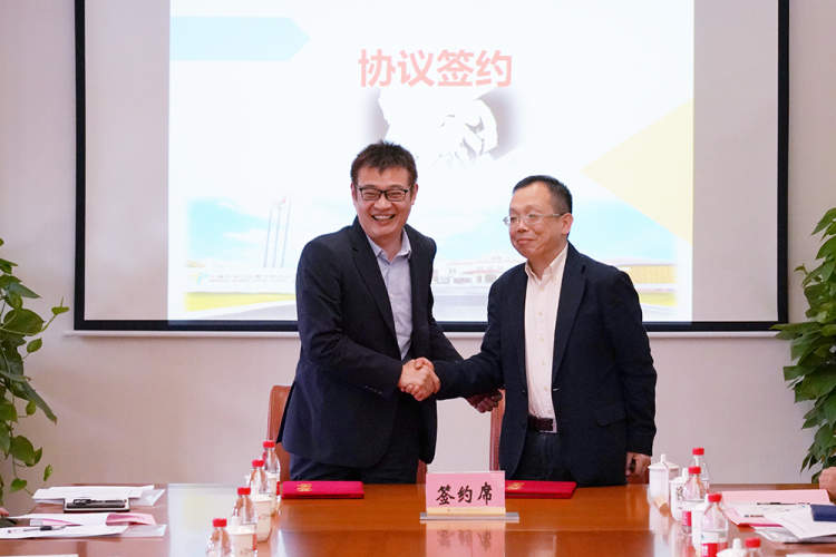 ▲上海市教委教研室主任王洋(左)和宝山区教育局局长杨遇霖(右)共同签订《上海中小学科创课程平台种子课程(高中)宝山区域推广合作协议》