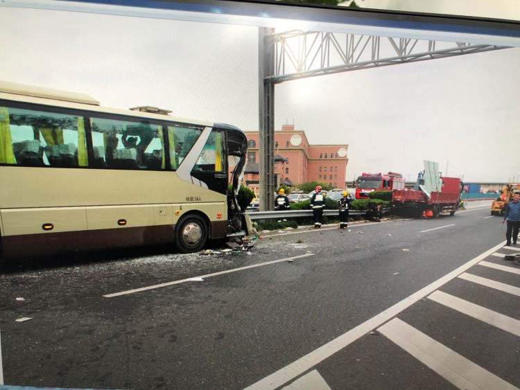 10月29日14时25分,G2高速公路嘉定段往市区方向,盛某驾驶载有29名中老年人的沪牌大巴追尾一沪牌卡车,造成大巴车5人伤,其中,大客车驾驶员盛某右腿截肢,4名乘客皮外伤。