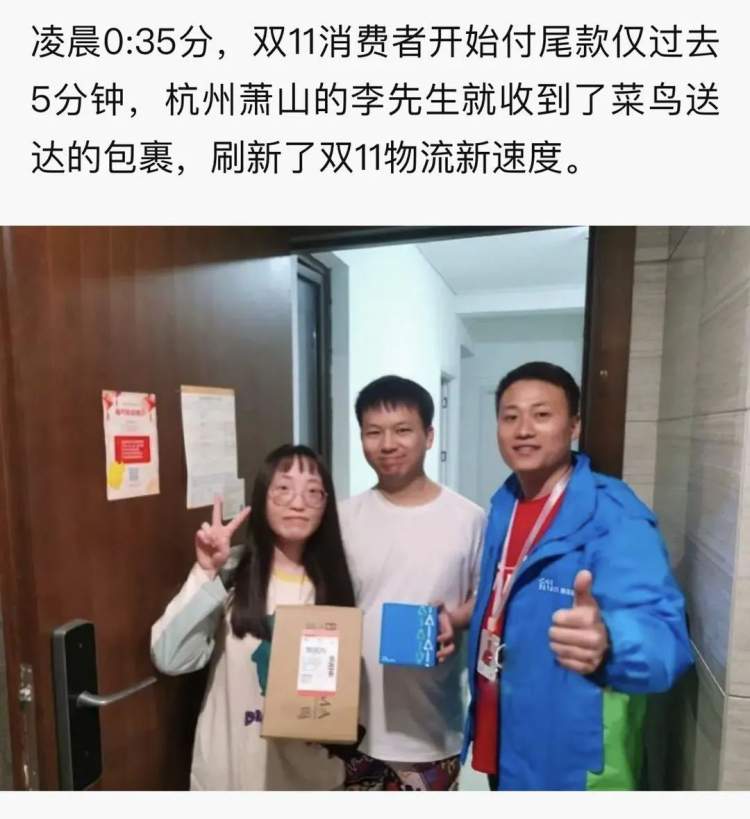 还有更快的速度:11月1日凌晨0:35分,“双11”消费者开始付尾款仅过去5分钟,杭州萧山的李先生就收到了菜鸟送达的包裹,刷新了“双11”物流新速度。
