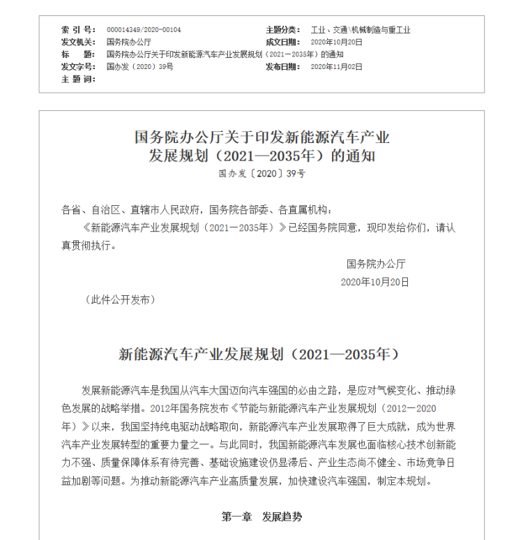 今天,国务院办公厅发布《关于印发新能源汽车产业发展规划(2021—2035年)的通知》,通知指出,到2025年,我国新能源汽车市场竞争力明显增强,动力电池、驱动电机、车用操作系统等关键技术取得重大突破,安全水平全面提升。纯电动乘用车新车平均电耗降至12.0千瓦时/百公里,新能源汽车新车销售量达到汽车新车销售总量的20%左右,高度自动驾驶汽车实现限定区域和特定场景商业化应用,充换电服务便利性显著提高。