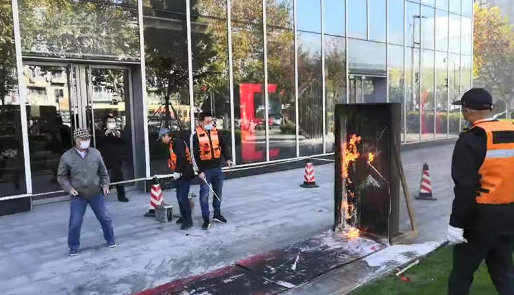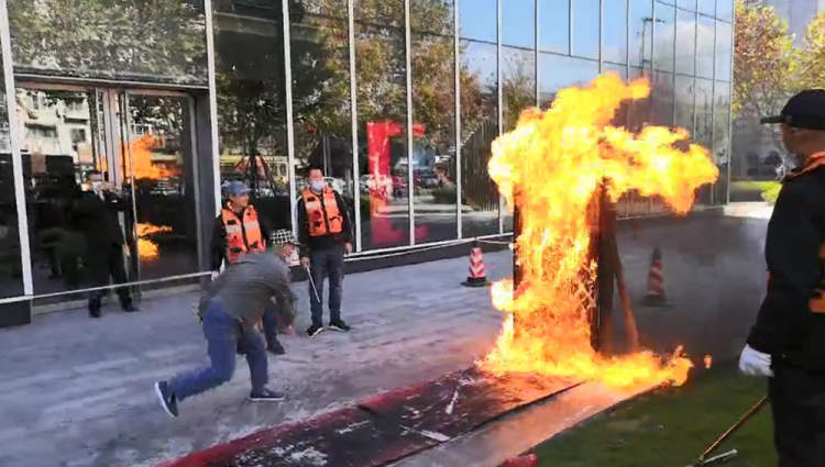 工作人员在一堵类似房门的木墙边,点燃地上的汽油,瞬间燃起熊熊大火。这时,一名参与体验的市民拿起一瓶“矿泉水瓶(600毫升)大小”的红色瓶子,用力朝起火的“房门”砸了过去,红色瓶子爆裂后,里面溅出的液体瞬间扑灭了原本熊熊燃烧的大火。