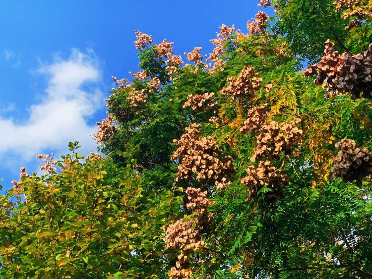栾树,无患子科栾树属植物,在上海应用较广泛,夏末秋初黄花满树,稍有芬芳。入秋叶色变黄,果实紫红色,十分美丽。