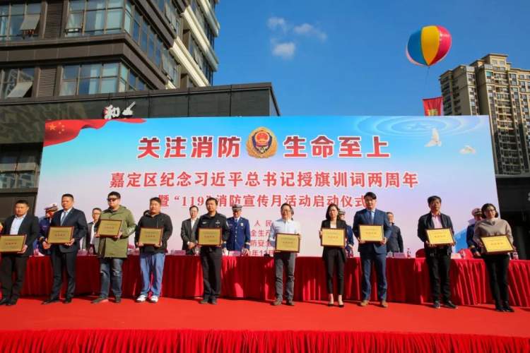 11月13日上午,嘉定区119消防宣传月活动启动仪式在嘉定信业广场隆重举行,对2020年度消防安全工作“先进单位”、“先进集体”和“先进个人”进行了颁奖表彰,区安委会、消防委成员单位、各街镇领导,各派出所、安监站、房管所、市场监管所负责人等300余人参加启动仪式。