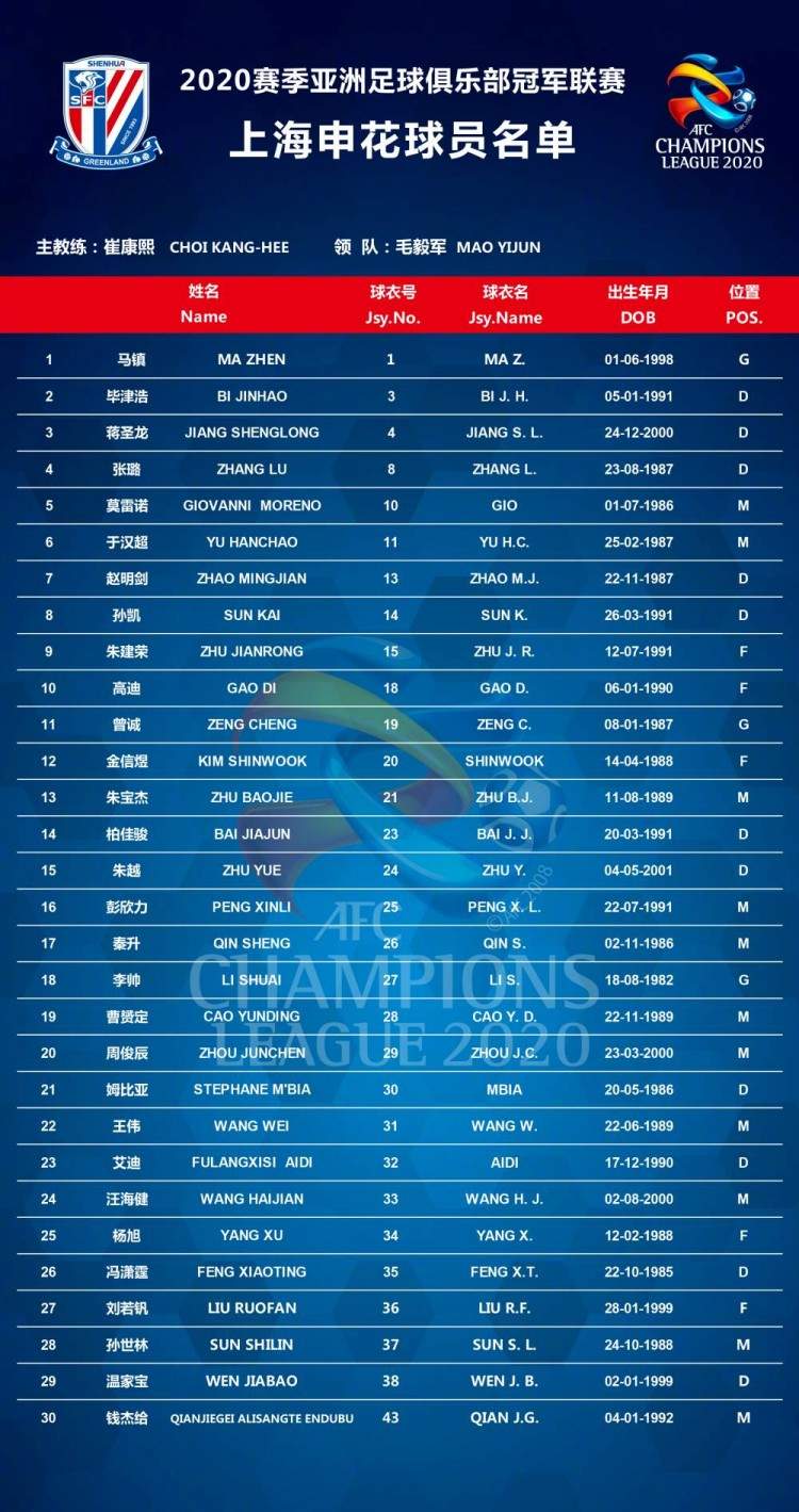 进入30人申花亚冠名单的队员具体是:马镇、毕津浩、蒋圣龙、张璐、莫雷诺、于汉超、赵明剑、孙凯、朱建荣、高迪、曾诚、金信煜、朱宝杰、柏佳骏、朱越、彭欣力、秦升、李帅、曹赟定、周俊辰、姆比亚、王伟、艾迪、汪海健、杨旭、冯潇霆、刘若钒、孙世林、温家宝、钱杰给。