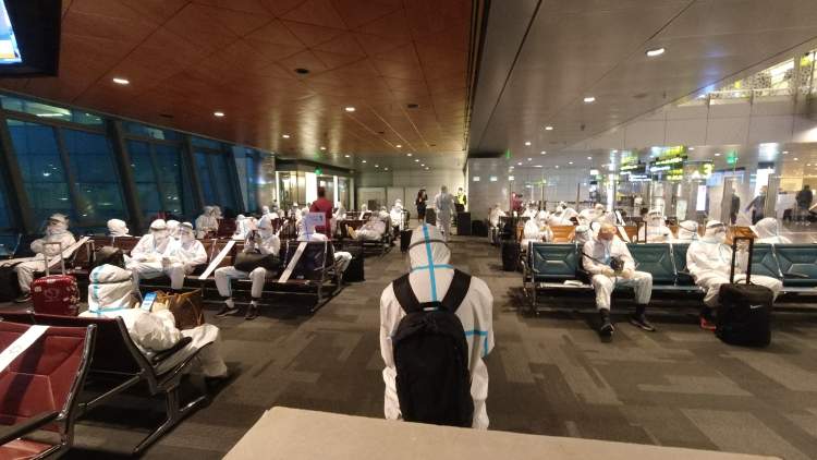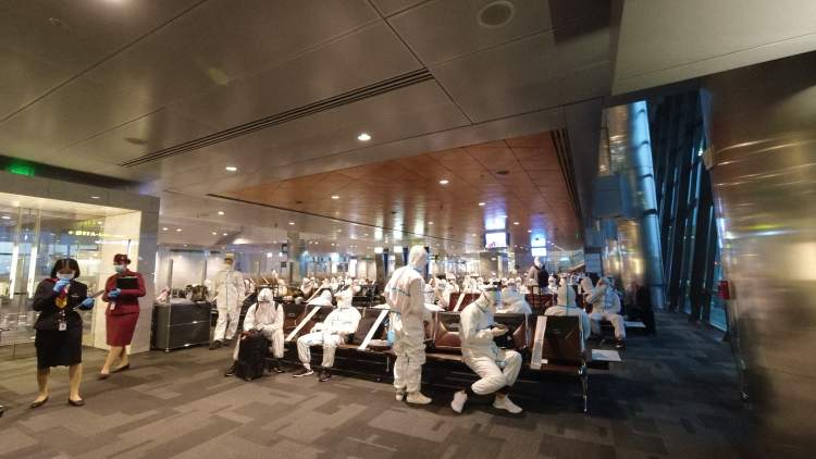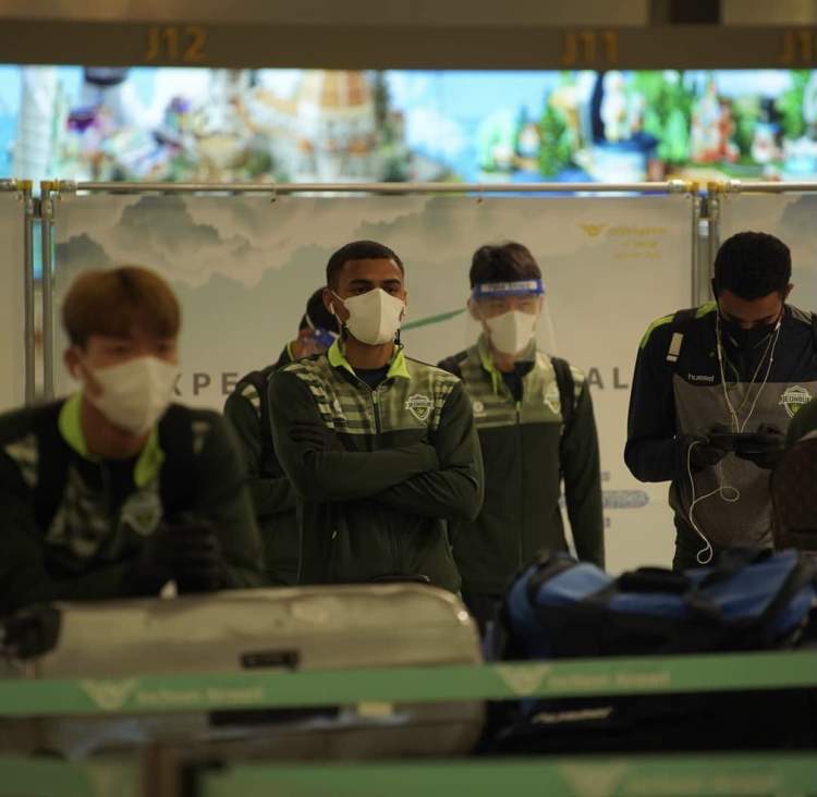 此次远征西亚参加亚冠比赛,最重要的就是做好防疫工作。因此,上港队全队在下飞机前就都穿戴好了事先预备的口罩、防护服、护目镜和手套,“全副武装”地进入机场入境大厅。