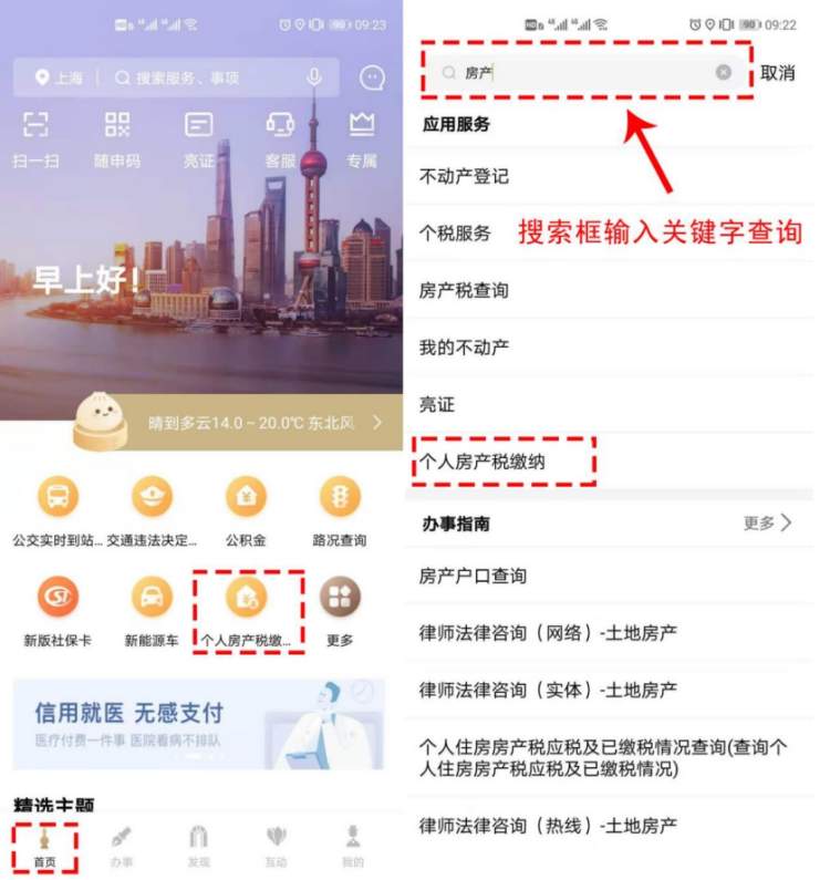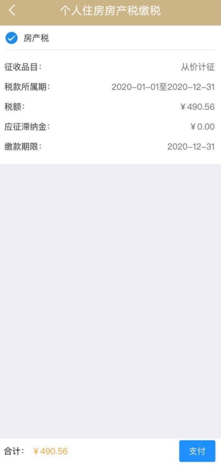 或通过首页的“生活服务”点击进入“个人房产税缴纳”。