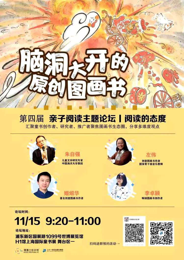 11月15日上午,二十一世纪出版社集团与蒲蒲兰文化发展有限公司共同举办的中国原创图画书论坛“阅读的态度:脑洞大开的原创图画书”在上海国际童书展举行。儿童文学研究专家朱自强,和左伟、姬炤华、李卓颖三位创意图画书作者作为此次活动的主讲嘉宾,聚焦图画书生态圈,分享多维度观点。