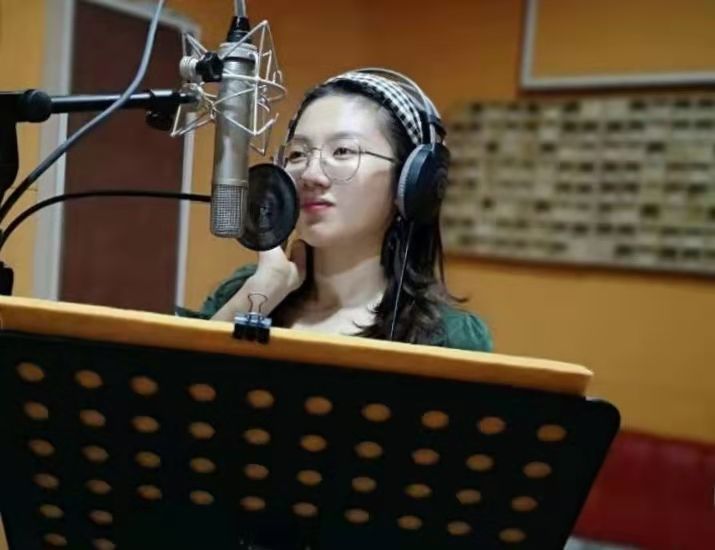 赵妤馨在录音棚里录制参赛小语种歌曲。受访者供图