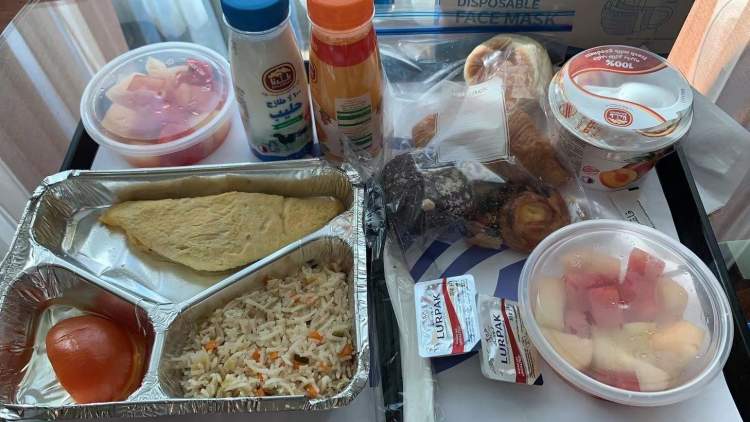 由于今天要在房间里进行10个小时的隔离,早中晚三餐都将由专人送至房间。三餐的时间分别是早餐8点、午餐12点半、晚餐19点(均为卡塔尔当地时间)。从早餐看,相对比较简单,只有炒饭、煎蛋、面包、水果、饮料等。