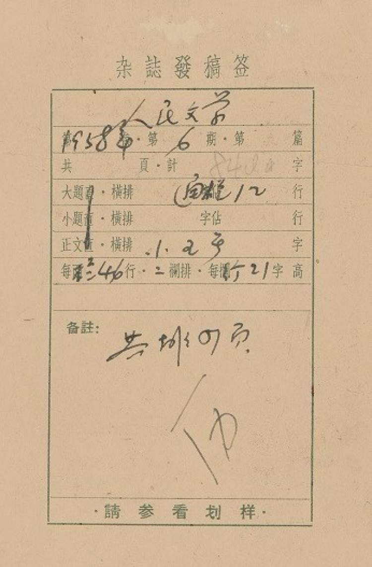 茅盾先生是中国现代著名作家、文学评论家、文化活动家以及社会活动家。茅盾在1958年写下评论文章《谈最近的短篇小说》,载于当年《人民文学》第6期。文章手稿共30页,全部用毛笔写成,保存至今,除了纸质微微泛黄外,品相甚好,同时保存下来的,还有当时刊发该文的《人民文学》发稿签。