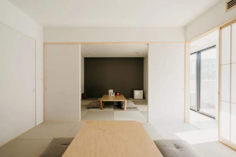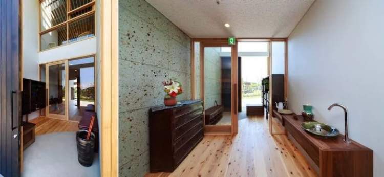 长型建筑是一个开放式的公共空间,公共空间从左到右依次是玄关、和室、拥有暖炉的餐厅、露天温泉、黄金浴、mother's room 、土间餐厅。