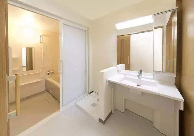 由于老人行动不太方便,进入浴室的路面设计成无障碍设计,必须要台阶的就采取平滑的缓坡进行过渡。