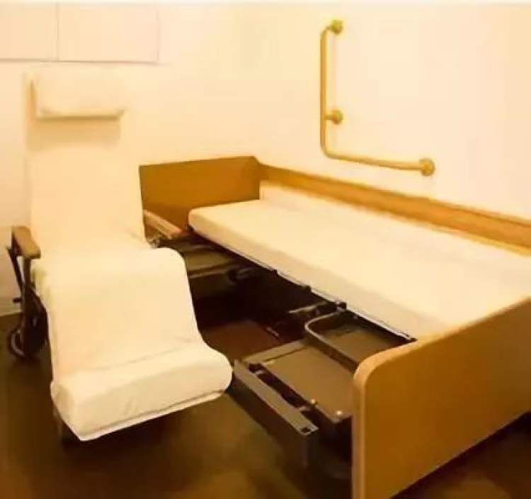 床可以自动调节高低,还可以拆卸直接转换成轮椅,方便老人在室内活动。↓