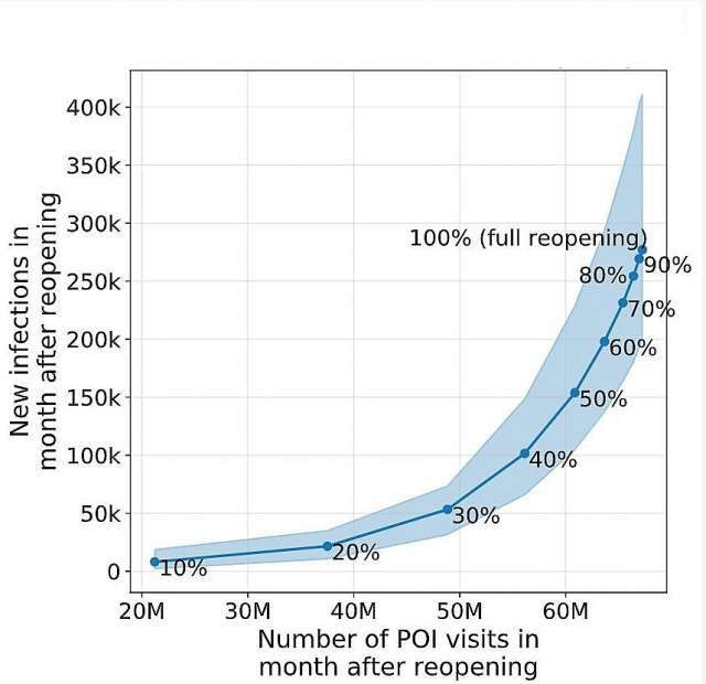 斯坦福大学研究团队以旧金山、洛杉矶、纽约、华盛顿等10个大城市的手机通信数据为基础,精确追踪了疫情暴发时9800万名手机用户每小时的移动情况,建立了一个预测模型。结果发现,预测数据与实际感染情况非常吻合。研究报告显示,新增病例大多发生在餐厅、健身房和其他拥挤的公共室内空间,其中餐厅感染风险最大,比排名第2的健身房高出3倍。