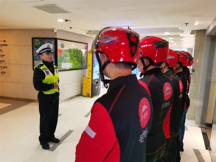 徐汇交警支队民警二大队警长戴凯伦来到星游城附近的饿了么、美团外卖小哥集结地,对正在岗前训示的70多名骑手开展安全宣讲。