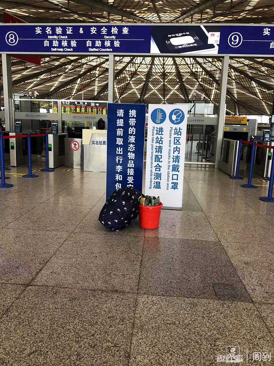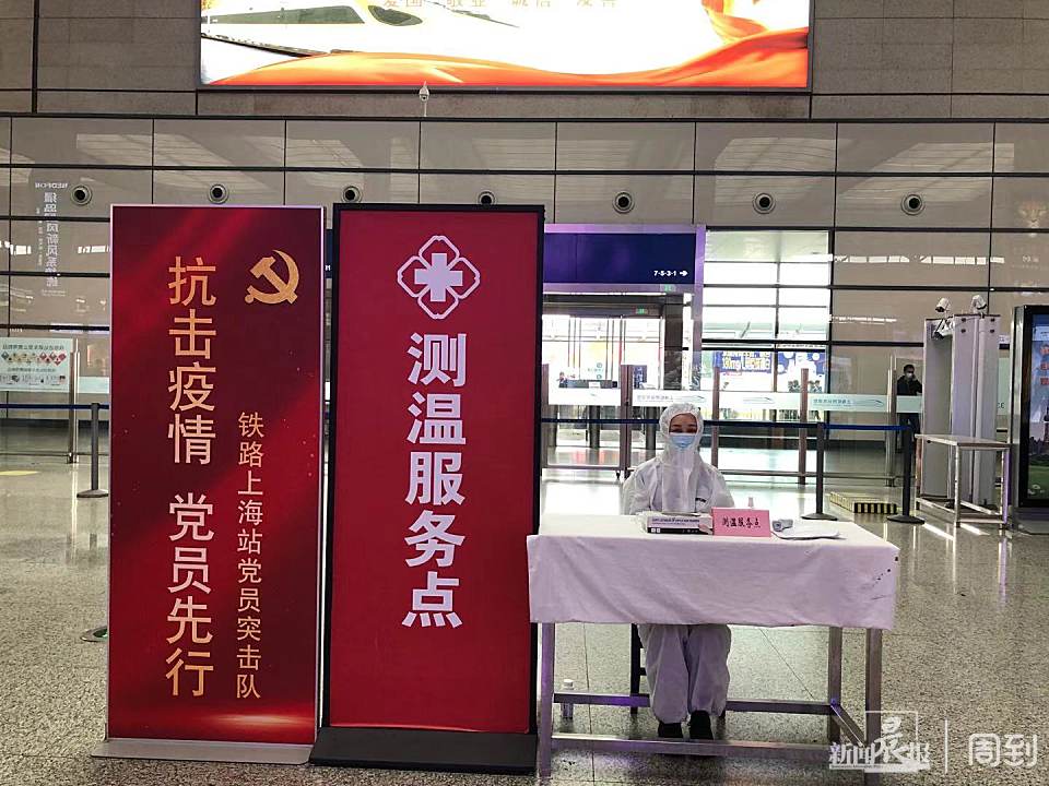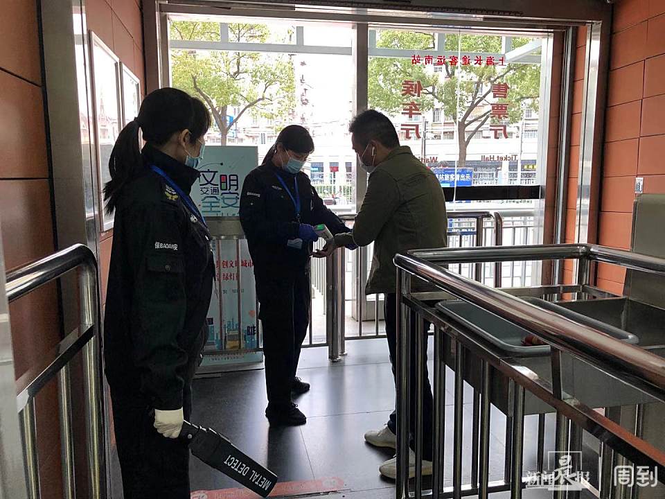在铁路上海南站,因和虹桥火车站同属铁路上海局集团公司管辖,整个疫情防控流程基本相似,红外线测温仪安装在安检门上方,在为旅客安检的同时完成“无感”测温,有效节约了时间,保证大量旅客进站时的安检速度。列车的到达、候车、工作人员的工作和志愿者服务也有序进行。