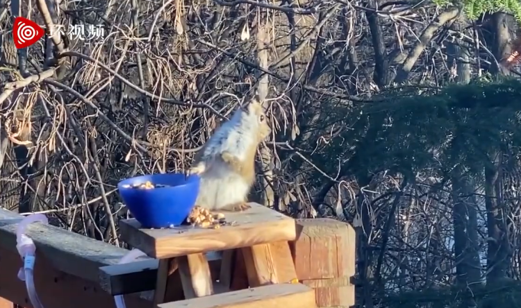 拍摄者凯瑟琳说,她把冰箱里放久的梨子放在室外,没想到被松鼠吃掉,第二天早晨就看到这个小家伙东倒西歪地吃种子和玉米组成的“宿醉早餐”。