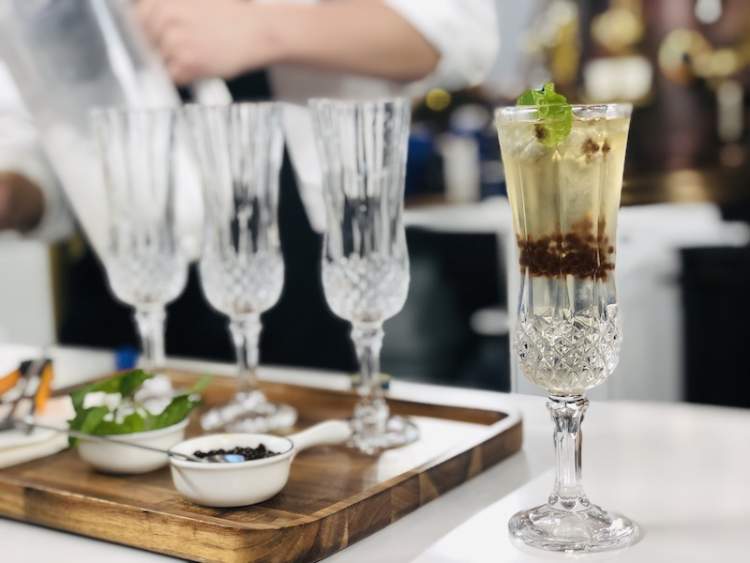 亲手调制一杯咖啡风味创新酒——鱼子酱鸡尾酒,咖啡制成的鱼子酱落入杯中,口感浓厚与清冽并存,趣味十足。