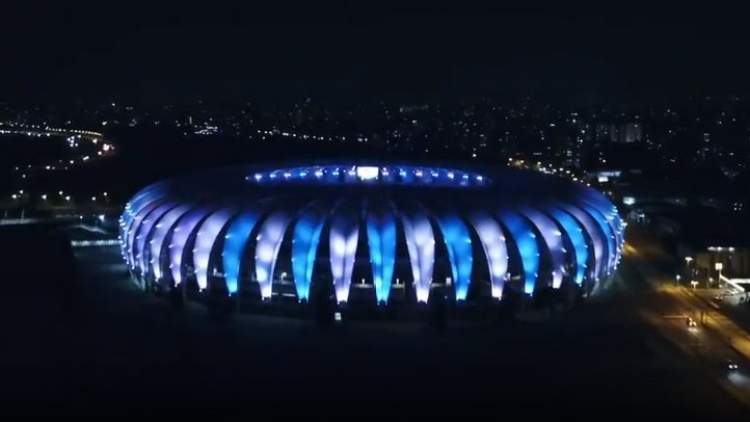 蓝白灯光亮起,作为昔日的诺坎普之王,巴塞罗那用这样的方式,为阿根廷球王照亮。