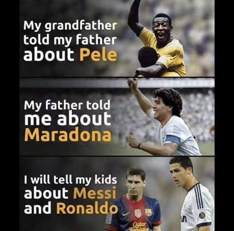 我的爷爷告诉我的父亲关于贝利;我的父亲告诉我关于马拉多纳;我会告诉我的孩子关于梅西和C罗。