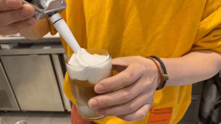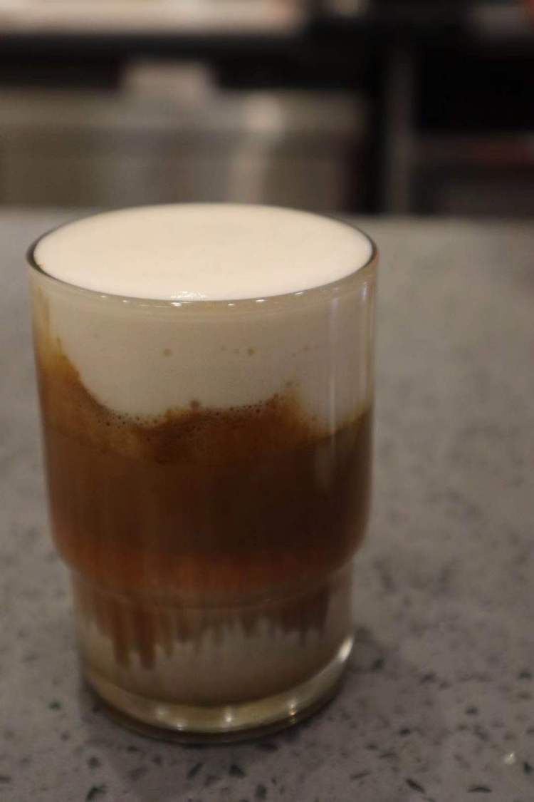 底层是冰博客牛奶,中间是白桃风味的浓缩咖啡液(白桃冻干和咖啡粉在咖啡机中萃取),上桌后再加入燕麦牛奶奶泡,有种dirty的感jio。