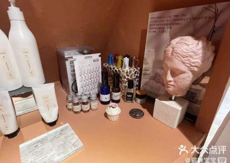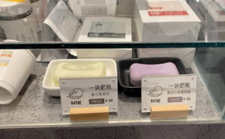 玻璃柜里则陈列着香皂之类的小物件,“蜜瓜青提味”“黑加仑茉莉花味”……