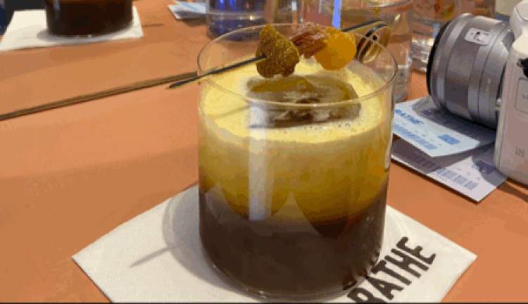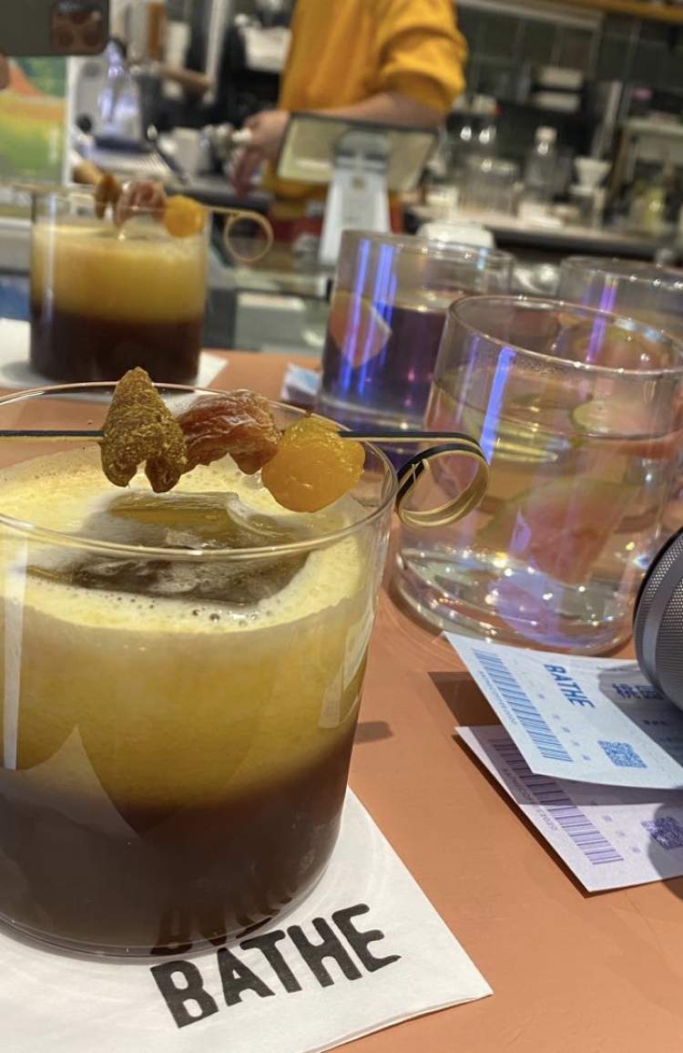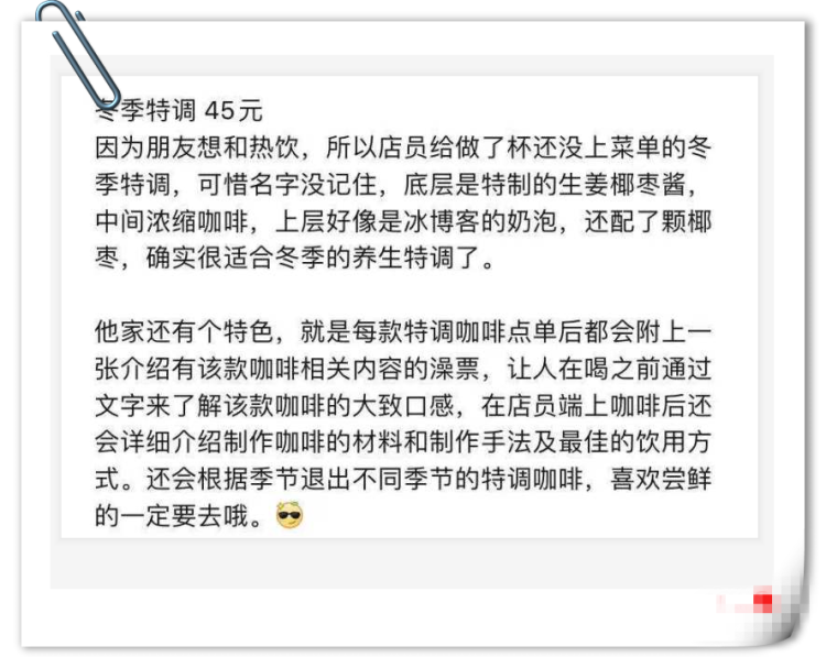 周到君在点评网上看到,有客人表示曾喝到过特制生姜椰枣酱打底的咖啡,还配了一颗椰枣,堪称冬季养生特调了。