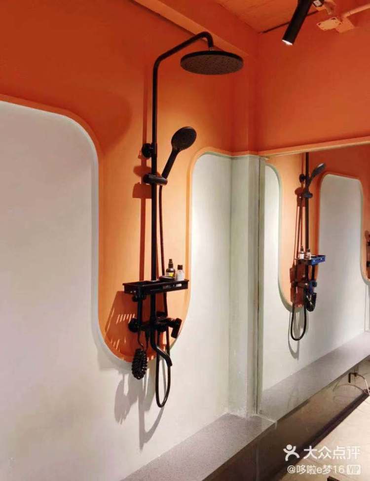 吧台区外有卡座,靠墙的座位旁设置了半圆形的“梳妆镜”,模拟浴室的设置。