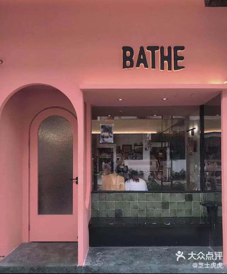 粉色的店面,门口有一个小桌子和坐下休息的地方,看起来不起眼,但店名相当独特——BATHE!
