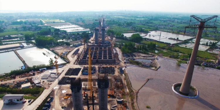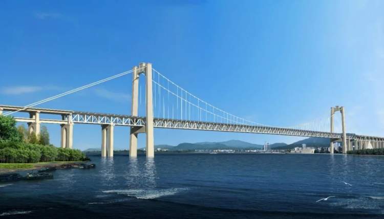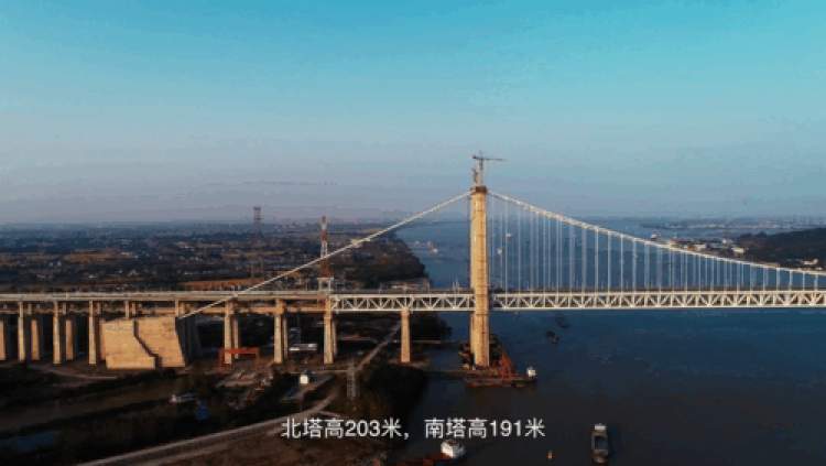 据介绍,五峰山长江大桥于2015年10月28日开工建设。2020年4月22日,主桥铺轨完成。大桥全长6.409公里,主梁为板桁结合钢桁梁,长江南岸的主塔高191米,长江北岸主塔高203米。桥北位于镇江市丹徒区高桥镇,桥南位于镇江市新区五峰山脚下。大桥为4线铁路(2线连镇高铁、2线预留)和双向8车道高速公路的公铁两用大桥。