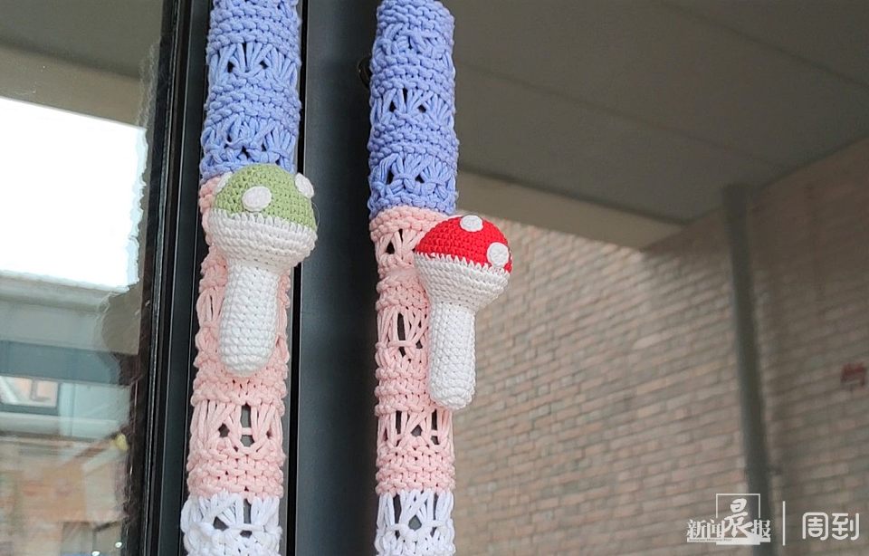 商铺入口的门把手和楼宇立柱是人们频繁触碰的地方,毛衣的存在隔绝了寒凉的触感。园区里色彩缤纷的毛衣与路人身上的毛衣相映成趣,对于披上毛衣的小树来说,这个冬天也变得温暖了许多。