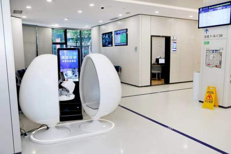 在上海市第十人民医院急诊科内,坐进颇具未来感的“太空舱”,插入医保或社保卡,便可以通过触摸屏与AI超级医学大脑互动。