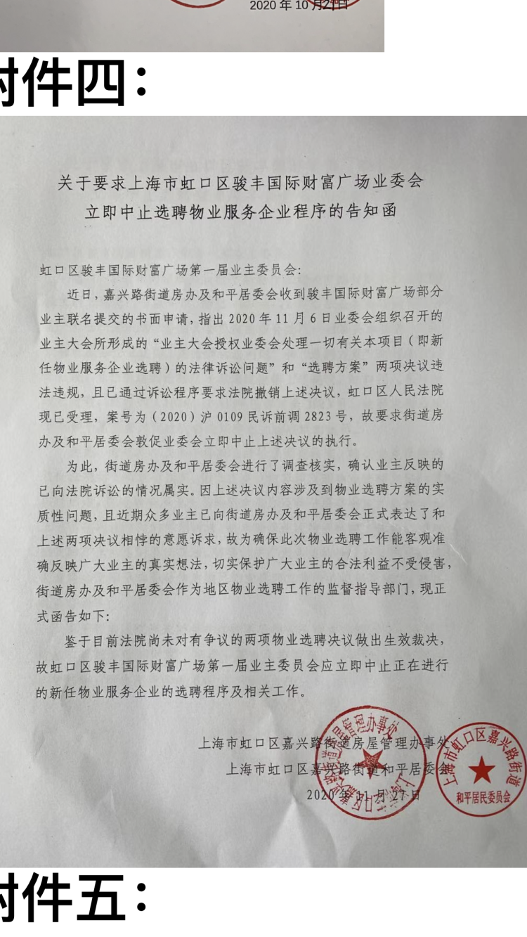 11月27日,嘉兴街道与和平居委在得知有十余名业主到法院起诉业委会以及有几名业主到居委会反映质疑业主大会后,第二次联合发出公告要求中止物业选聘的业主大会。