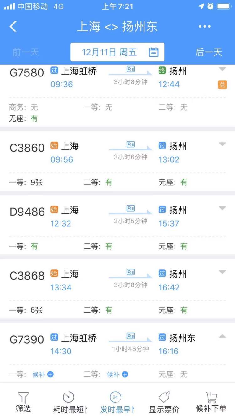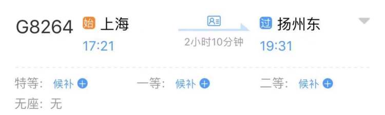 9:58分,扬州东往上海虹桥的高铁即将发车,该趟列车为特别班次,为扬州各界人士、市民代表及媒体“承包”了。记者通过12306客户端查询,上海虹桥今天往扬州东方向的高铁车票紧张,部分班次已经售罄。