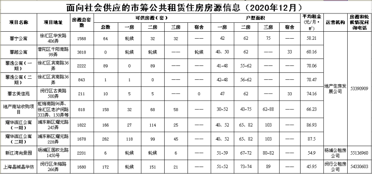 从12月市筹公共租赁住房房源信息中可以看出,单位职工住房困难的到了很好保障,相关公租房运营机构制定了详细的供应方案。其中,馨逸公寓(一期)、馨逸公寓(二期)、馨古美佳苑、地产南站收购公租房(凌云新村、金塘小区、东荡小区)、耀华滨江公寓(一期)、耀华滨江公寓(二期)仅限单位集体租赁,对参与和服务本市科创中心、自贸试验区建设的全市各级机关、中央在沪企事业单位、市属重点企事业单位等予以重点支持。