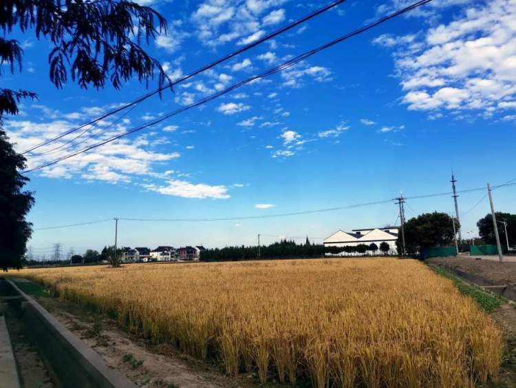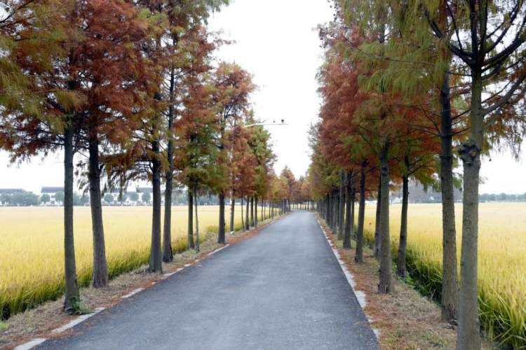 金灿灿的晚稻压弯了腰,大片大片地等待着收割,干净的乡村道路两旁整齐的排列着树木,中新村慢慢披上了初冬的色彩。