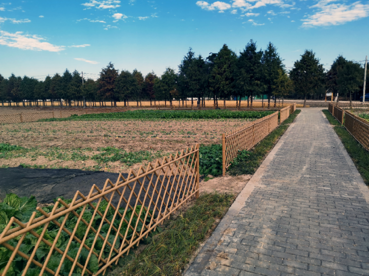 走在新建的步道上,在河道两旁,灌木丛生,倒影清晰地映衬在河面上,心情顿时也爽朗起来,一路前行,还有用篱笆围建起来的小菜园。