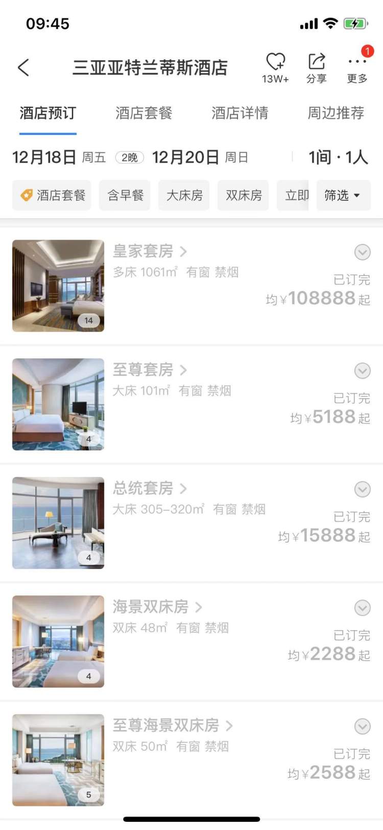 以海棠湾的亚特兰蒂斯酒店为例,近期该酒店的普通海景房已经几乎全部定完,仅剩下少量皇家俱乐部海景房,价格在每晚7000元以上,以及6万元和10万元的水底套房。