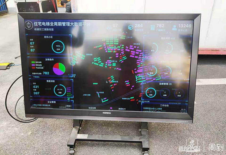 仪式现场,一块大屏幕上显示着江浦路街道住宅电梯全周期管理大数据平台的信息,弹窗内正在直播加梯开工的实况。